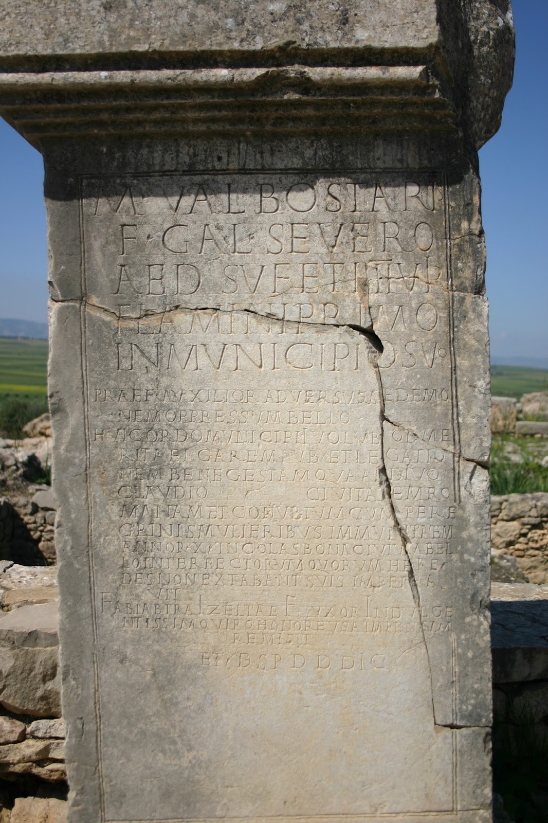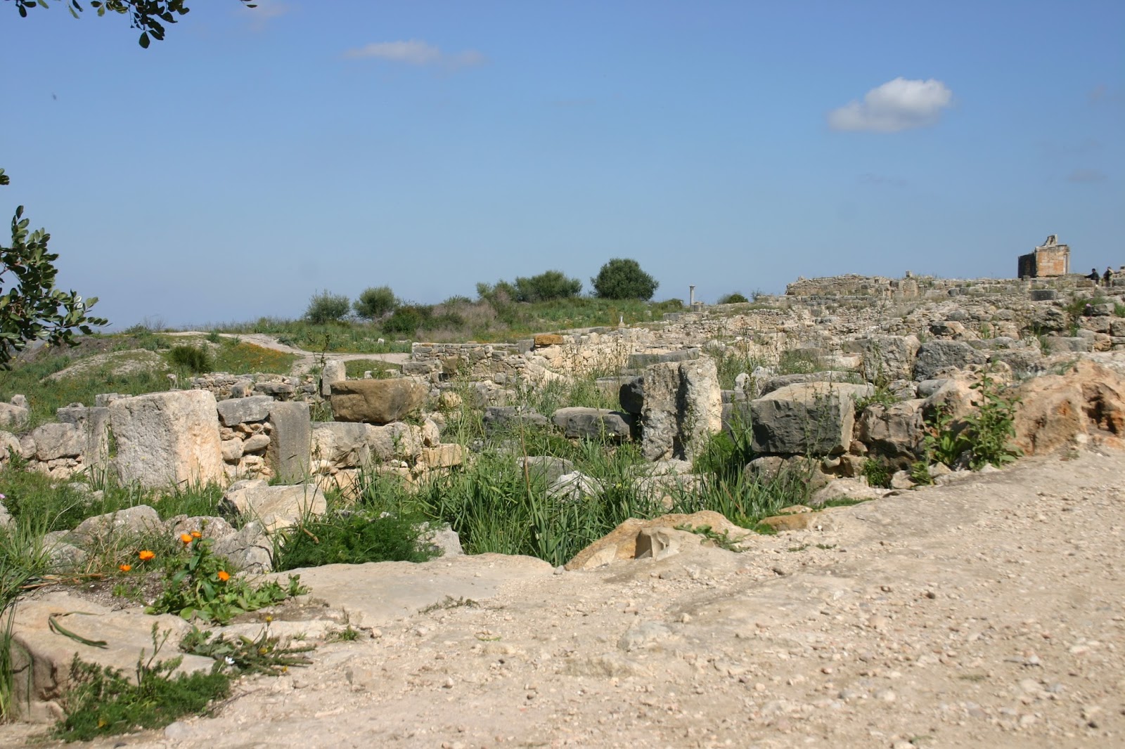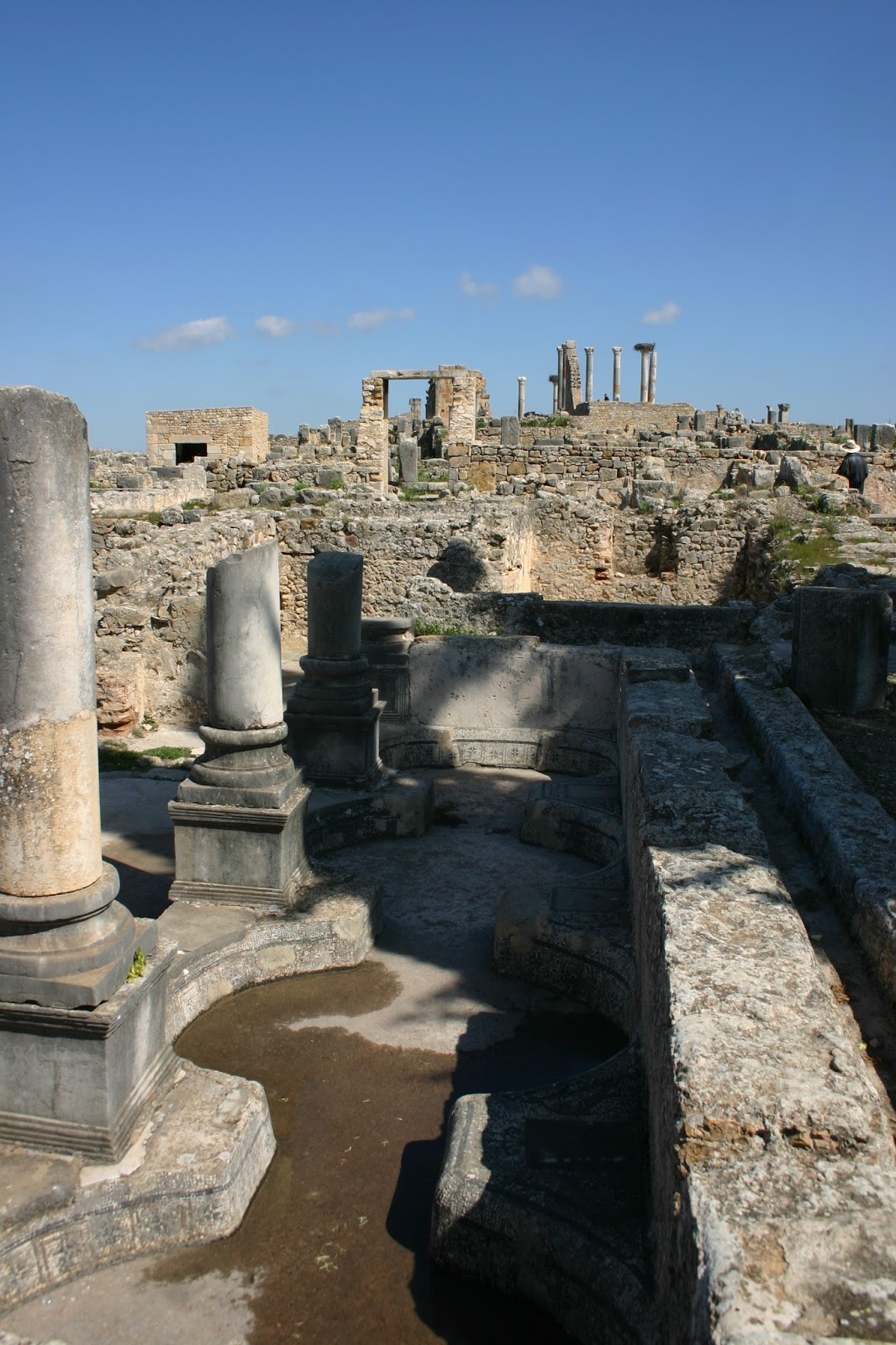 Lo más espectacular en las ruinas es la vía principal Decumanus Máximos, que se inicia en la puerta de Tánger y termina el arco del Triunfo de Caracalla del 217 d.c. Está pavimentada y rodeada de casas amplias y decoradas.